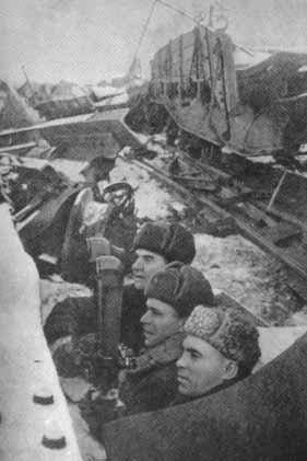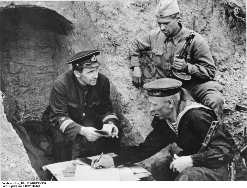 An NKVD regiment and other units held the strategically sited Mamaev Kurgan, keeping German guns from controlling the Volga.[lxx] The defenders fought house to house and block by block, Army and NKVD were reinforced by Naval Infantry. Chuikov conducted the defense with a brutal ferocity, relieving senior commanders who showed a lack of fight and sending many officers to penal units. Chuikov funneled massed German attacks into “breakwaters” where the panzers and infantry could be separated from each other causing heavy German casualties.[lxxi]