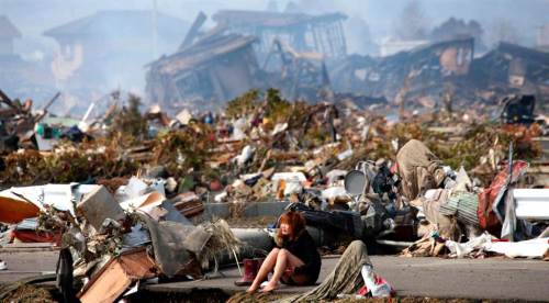 A Woman sits amid the rubble in the town of Natori, Myagi Prefecture