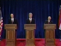Jane Pauley: Good evening. I’m Jane Pauley, and welcome to St. Louis for the first in our series of three presidential debates. Tonight’s debate among President George Bush, Arkansas governor Bill Clinton, and diminutive Texas billionaire Ross Perot will begin in just a moment. But first, let me introduce my fellow panelists, CNN anchor Bernard Shaw and ABC News political correspondent Sam Donaldson. Now, let’s meet the candidates. Gentlemen. [ the three candidates enter the arena and stand behind their respective podiums ] The first question will be asked by Sam Donaldson.