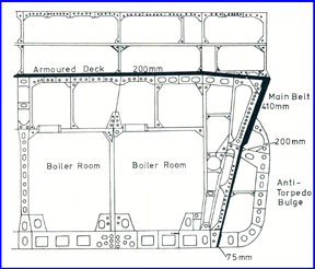 The ships were protected by a massive armored belt ranging from 16 inches to 8 inches with 26 inch armor on the face plates of the main gun turrets. The armor was advanced with excellent sloping but had a flaw where the upper and lower belts connected just below the waterline which exposed them to damage from torpedoes.