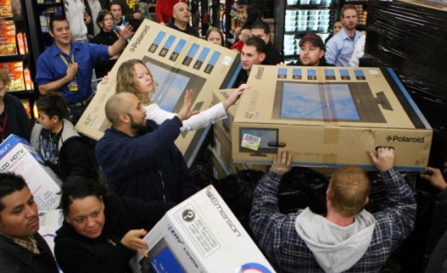 While the professional football players ready themselves for combat the professional bargain hunters are preparing for their own form of mortal combat where no prisoners are taken and the weak to do not survive. Yes it is “Black Friday Eve” and though many will sacrifice by camping outside of stores in abominable weather, deceiving potential rivals to get a better place in line and if need be resorting to violence to make their Christmas wishes come true.  As for me I will avoid big retailers like the plague and do almost all of my shopping online where I feel safe in my virtual world.  The sad thing in this is that so many employees of the big stores are already at work preparing for the Black Friday deals and sales that they will not be with their families, friends or other loved ones today. But who cares about them? If we can get a big HDTV made by slave laborers in China at big savings  isn’t it worth it?
