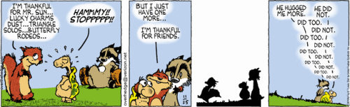 Stephen Colbert says it this way: “Thanksgiving is a magical time of year when families across the country join together to raise America’s obesity statistics. Personally, I love Thanksgiving traditions: watching football, making pumpkin pie, and saying the magic phrase that sends your aunt storming out of the dining room to sit in her car.”