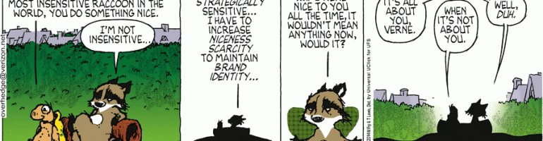 Friends of Padre Steve’s World. Those who follow me on Twitter and Facebook know how seriously I take the funnies. In fact I think my wife Judy finds it pathetic in the way I can find me in the comics. One of my favorite cartoon Characters is RJ Raccoon from Michael Fry’s “Over the Hedge.” Somehow RJ’s Theory of Strategic Sensitivity makes complete sense to me. Have a great day! Peace, Padre Steve+