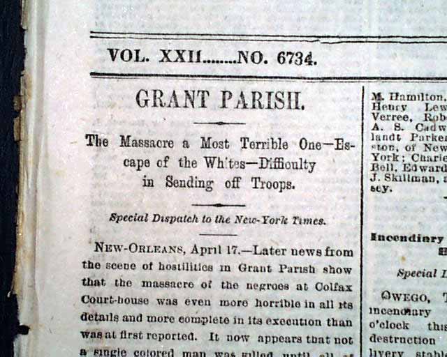“The Democrats (White) of Grant Parish attempted to oust the incumbent parish officers by force and failed, the sheriff protecting the officers with a colored posse. Several days afterward recruits from other parishes, to the number of 300, came to the assistance of the assailants, when they demanded the surrender of the colored people. This was refused. An attack was made and the Negroes were driven into the courthouse. The courthouse was fired and the Negroes slaughtered as they left the burning building, after resistance ceased. Sixty-five Negroes terribly mutilated were found dead near the ruins of the courthouse. Thirty, known to have been taken prisoners, are said to have been shot after the surrender, and thrown into the river. Two of the assailants were wounded. The slaughter is greater than the riot of 1866 in this city. Will send report by mail.” [8]