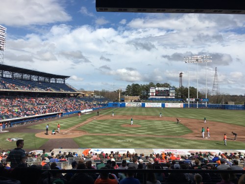 By the time we got to Harbor Park the weather was clearing, bit when I looked at the field there was standing water in the outfield and the warning track and foul corners looked like lakes. The ground crew was already working to dewater the field and remarkably they had the field in good shape and the game began just a few minutes after the scheduled first pitch. It turned out to be gorgeous baseball weath, as if the God of Baseball was smiling on us, and the game was good. We left it a bit early in the bottom of the 6th inning thinking that it was a 7 inning exhibition and as we left the ballpark the clouds were building up and the local EMS and news were broadcasting that the area was under tornado watch.