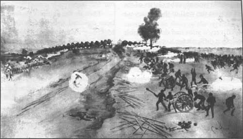 Bigelow’s artillerymen fought like demons he described the effect of his fire on Kershaw’s South Carolinians “the Battery immediately enfiladed them with a rapid fire of canister, which tore through their ranks and sprinkled the field with their dead and wound, until they disappeared in the woods on our left, apparently a mob.” [7] They poured a merciless stream of fire into the advancing Confederates until “they had exhausted their supply of canister and the enemy began to close in on his flanks.” [8] A German born gunner noted “we mowed them down like grass, but they were thick and rushed up.” [9] A hand to hand fight ensued among the guns but the Massachusetts men escaped losing 28 of its 104 men engaged,[10] the brave commander Bigelow was wounded and nearly captured but one of his men helped him to the rear.