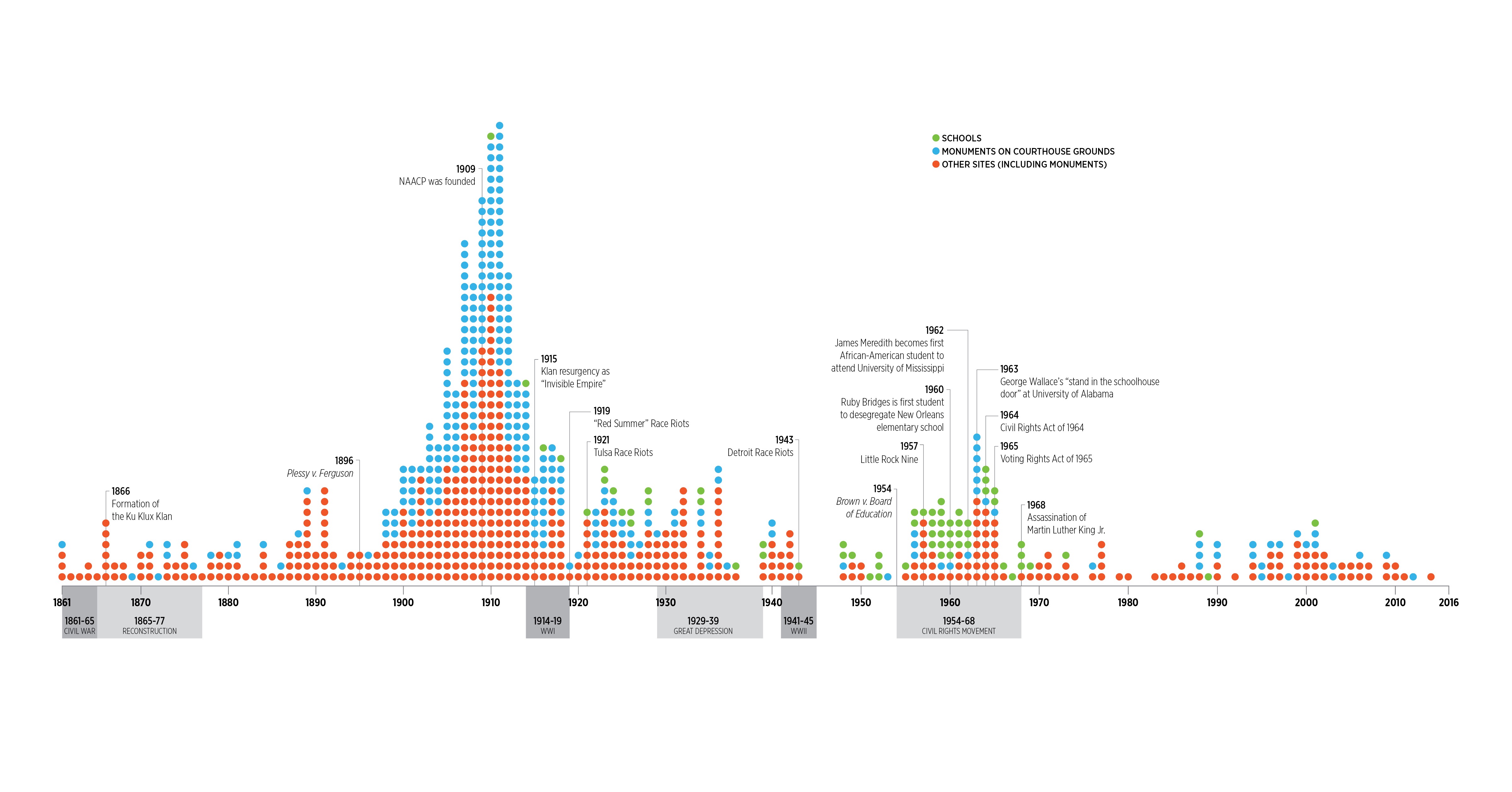But honestly, those memorials are but a minority. Most of the Confederate monuments that spark such freak controversy today were erected anywhere from 30 to 150 years after the war. The periods that they were built are interesting of themselves. The biggest spike in construction began in the immediate aftermath of the Plessy v. Ferguson ruling that legalized Jim Crow and the second during the backlash against the Civil Rights Movement beginning around 1948. The chart below provides a good representation of when the Confederate monuments were built.
