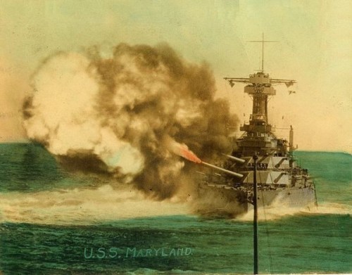At Pearl Harbor Maryland was moored inboard of Oklahoma and was hit by 2 bombs and her crew helped rescue survivors of that unfortunate ship. She was quickly repaired and returned to action. She received minimal modernization during the war. She participated in operations throughout the entirety of the Pacific Campaign mainly conducting Naval Gunfire Support to numerous amphibious operations. She was present at Surigao Strait where despite not having the most modern fire control radars she unleashed six salvos at the Japanese Southern Force.