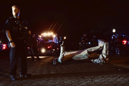 But last night at least two important Confederate Monuments were toppled or so heavily damaged before authorities could have them removed. The first was the statue of Confederate President Jefferson Davis on Richmond’s Monuments Boulevard, which was toppled from its base. The other was Portsmouth, Virginia’s monument to “Our Confederate Dead.” The city council had taken up a discussion about removing the monument, but demonstrators accompanied by a brass band with no police intervention, heavily damaged it amid a party like atmosphere.