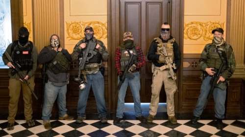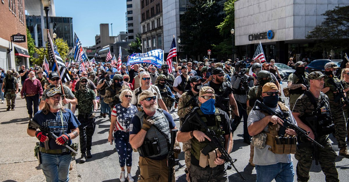 Armed pro-trump militia members demonstrate in Louisville Kentucky on the day of the famous Kentucky Derby, which is held in the city.