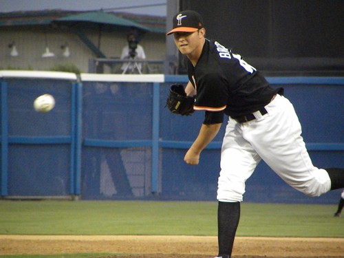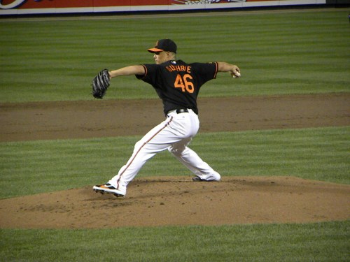 Orioles starting Pitcher Chris Tillman (shown in Norfolk 2010) pitched 6 no-hit inning against the Rays before being lifted when his pitch count went over 100