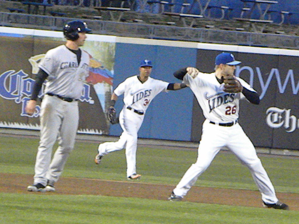 In the 9th inning Tides reliever Adam Russell loaded the bases but worked out of trouble to keep the score at 4-3. In the bottom half of the inning Gray walked Trayvon Robinson and Canzler hammered a deep drive to left center which died at the wall. Gray then walked Danny Valencia. Travis Ishikawa singled to right scoring Robinson and advancing Valencia to 3rd. With one out and runners on 1st and 3rd Yamaico Navarro singled to center giving the Tides a walk off win.