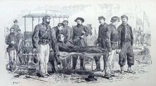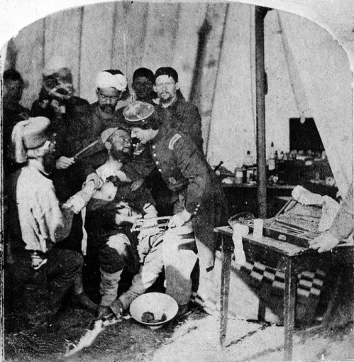 Field hospitals were often little more than butcher shops where arms and legs were amputated by overworked surgeons and attendants while those with abdominal wounds that could not be easily repaired were made as comfortable as possible. Triage was simple. If a casualty was thought to have a reasonable chance at survival he was treated, if not they were set aside in little groups and allowed to die as peacefully as possible. Churches were requisition for use of the surgeons. A volunteer nurse noted: “Every pew was full; some sitting, some lying, some leaning on others. They cut off the legs and arms and threw them out the windows. Every morning the dead were laid on the platform in a sheet or blanket and carried away.” [15]
