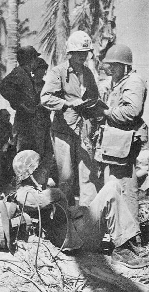 By afternoon Julian Smith realized that he needed more troops, his last battalion, 1/8 waited to go ashore.[lxxii] Smith asked for the 6th Marines. He had Rear Admiral Wilbur Hill, Commander of Amphibious Group Two, send a message to Admiral Richmond K. Turner stating “Issue in doubt. I concur.” This message sent a chill through the listening Naval Staff.[lxxiii]
