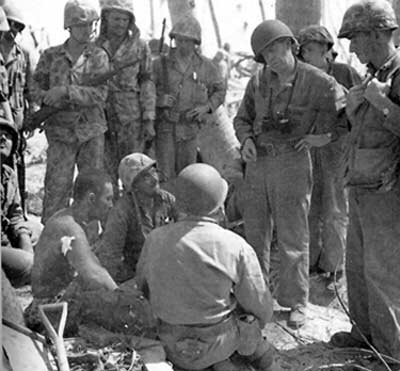 Members of the Second Marine Division Band assisted Navy Hospital Corpsman in bringing back wounded Marines.[lxxviii] For the rest of the day the Marines continued to eke out a beachhead. Shoup’s Marines on Red-2 and Red-3 managed to advance about halfway across the island, while 3/2 and elements 1/2 and 2/2 were isolated. Major Ryan of Lima Company 3/2 pulled them back to meet an expected Japanese counter-attack.[lxxix]