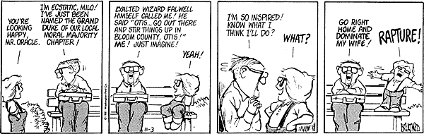 “Mark my word, if and when these preachers get control of the [Republican] party, and they’re sure trying to do so, it’s going to be a terrible damn problem. Frankly, these people frighten me. Politics and governing demand compromise. But these Christians believe they are acting in the name of God, so they can’t and won’t compromise. I know, I’ve tried to deal with them.” November, 1994, in John Dean, Conservatives Without Conscience.