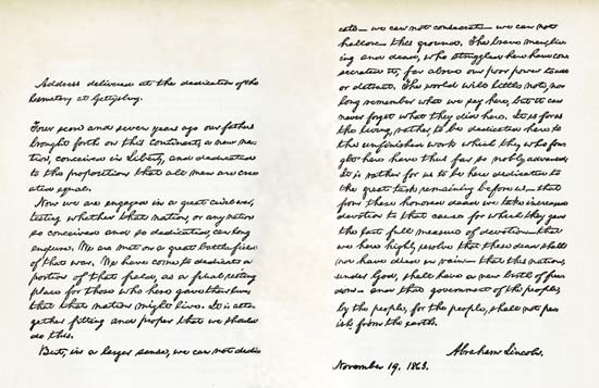 But, in a larger sense, we cannot dedicate — we can not consecrate — we can not hallow — this ground. The brave men, living and dead, who struggled here, have consecrated it, far above our poor power to add or detract. The world will little note, nor long remember what we say here, but it can never forget what they did here. It is for us the living, rather, to be dedicated here to the unfinished work which they who fought here have thus far so nobly advanced. It is rather for us to be here dedicated to the great task remaining before us — that from these honored dead we take increased devotion to that cause for which they gave the last full measure of devotion — that we here highly resolve that these dead shall not have died in vain — that this nation, under God, shall have a new birth of freedom — and that government of the people, by the people, for the people, shall not perish from the earth.[6]