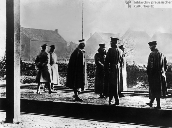 Wilhelm II. (4.v.l.) geht am Tag der Unterzeichnung seiner Abdankung über die Grenze in das holländische Exil