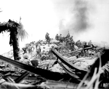 Marines wading ashore at Tarawa, since many landing craft could not cross the reef many waded hundreds of yards under constant Japanese fire