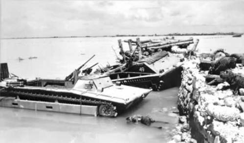 The Marines in the fourth to sixth waves were struggling to wade ashore from the reef. Landing craft “ran aground or milled about helplessly outside the reef, which was swept by crossfire from behind the beaches and from a grounded hulk northwest of the pier.”[lxv] Most of the tanks were put out of action either through accurate fire by Japanese guns or by sinking in deep areas of the lagoon, the Tank battalion commander was blown out of his Amtrack, wounded and survived 24 hours by clinging to a pile of dead bodies to keep from drowning.[lxvi]