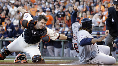 Buster Posey Tags out Prince Fielder on a key play in the 2nd inning of Game 2 (AP Photo David J Phillip)