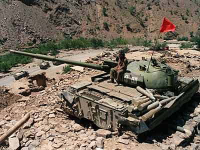 Soviet T-62 Tank guarding a convoy in a mountain pass