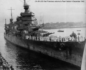 When repairs were complete she was attached to TF 16 escorting the USS Enterprise CV-6 during the Battle of the Santa Cruz Islands on 26 October 1942.  During the battle she was credited with shooting down 26 Japanese aircraft but was struck by a 500 lb bomb on her number one turret which caused no damage.