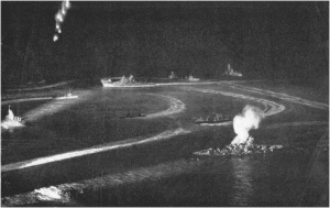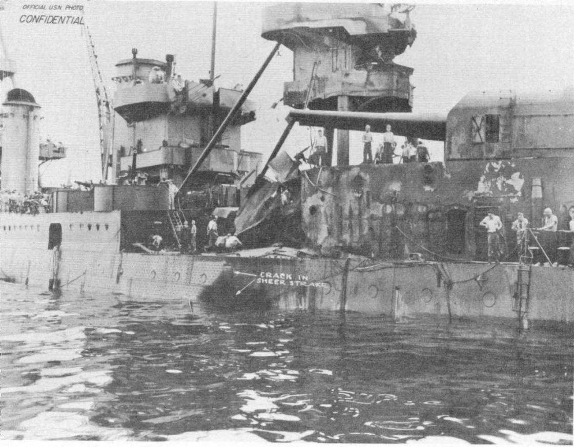During the process Mogami’s Navigator took over from the watch to oversee the tricky maneuver. In doing so he thought that there was too much distance between him and the ship ahead, the Mikuma. So he adjusted his course to starboard and then realized his mistake. The ship he thought was Mikuma was actually Suzuya and Mikuma was directly ahead. As soon as he recognized his mistake Mogami’s Navigator ordered a hard turn to port and reversed the engines but it was too late. Mogami’s bow crashed into Mikuma’s port quarter. The impact caused minimal damage to Mikuma but Mogami was heavily damaged. She lost 40 feet of her bow and everything else was bent back to port at right angles to her number one turret.