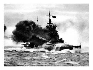 Bey, thinking he had shaken his pursuers, set course for Alta Fjord at full speed, however, Belfast had maintained contact and Fraser with Duke of York closed the distance and at 1617 her radar picked up the German at a range of 45,500 yards. By 1632 she was 29,700 yards away. Scharnhorst was oblivious to the danger, and at 1648 Belfast illuminated the German ship and Duke of York opened fire at just under 12,000 yards scoring hits which disabled Scharnhorst’s forward turrets and destroyed her airplane hanger. Bey changed course and increased speed, briefly opening the range and momentarily giving the Germans hope, but that was not to be.