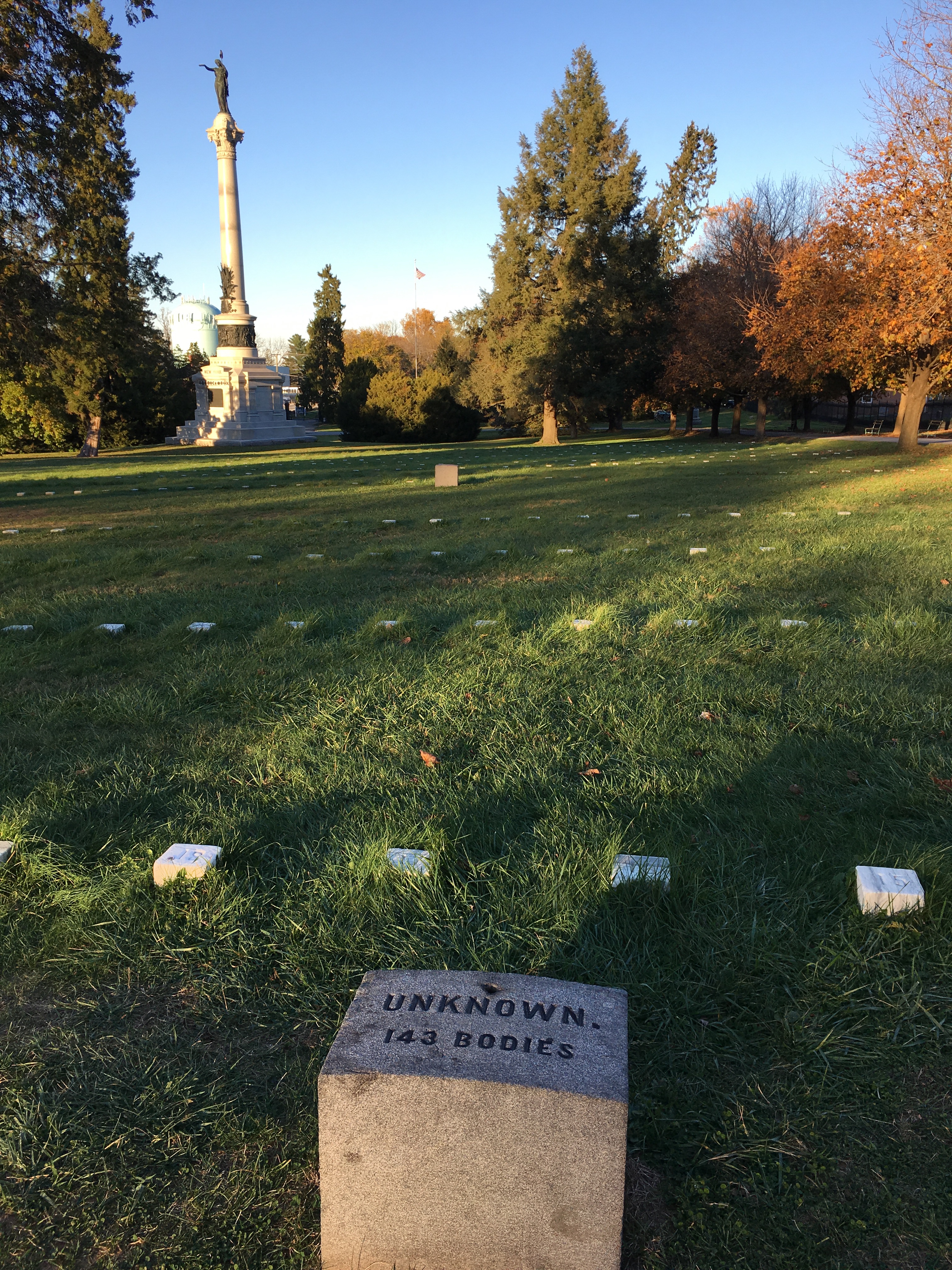 When one walks through the Gettysburg Soldier’s Cemetery one finds that the graves are arrayed in a fan shape, with designated areas for the dead from each loyal state that had soldiers at Gettysburg. They are placed without regard to rank as an acknowledgment of their equality. Those that could be identified are marked, while hundreds of others are marked as unknown. When I look at those that are marked ”unknown” I realize that all were sons, husbands, fathers, nephews, and friends of others. Their families never had closure.
